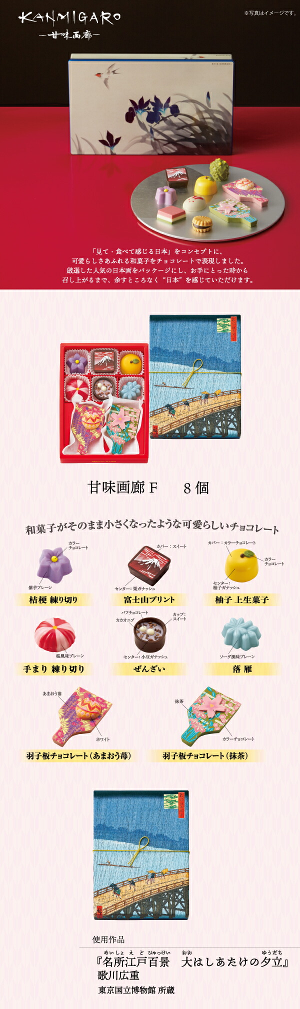 Уникальная коллекция шоколада Kanmigaro продолжает нас знакомить с шедеврами японского искусства. Здесь с легкостью и изыском смешаны классика японских сладостей вагаси и традиции шоколадных ассорти бон-бон. Печать на коробках безупречного качества. Это изящное знакомство с японскими вкусами и теплый подарок для знатоков и любителей Японии в любом уголке мира.